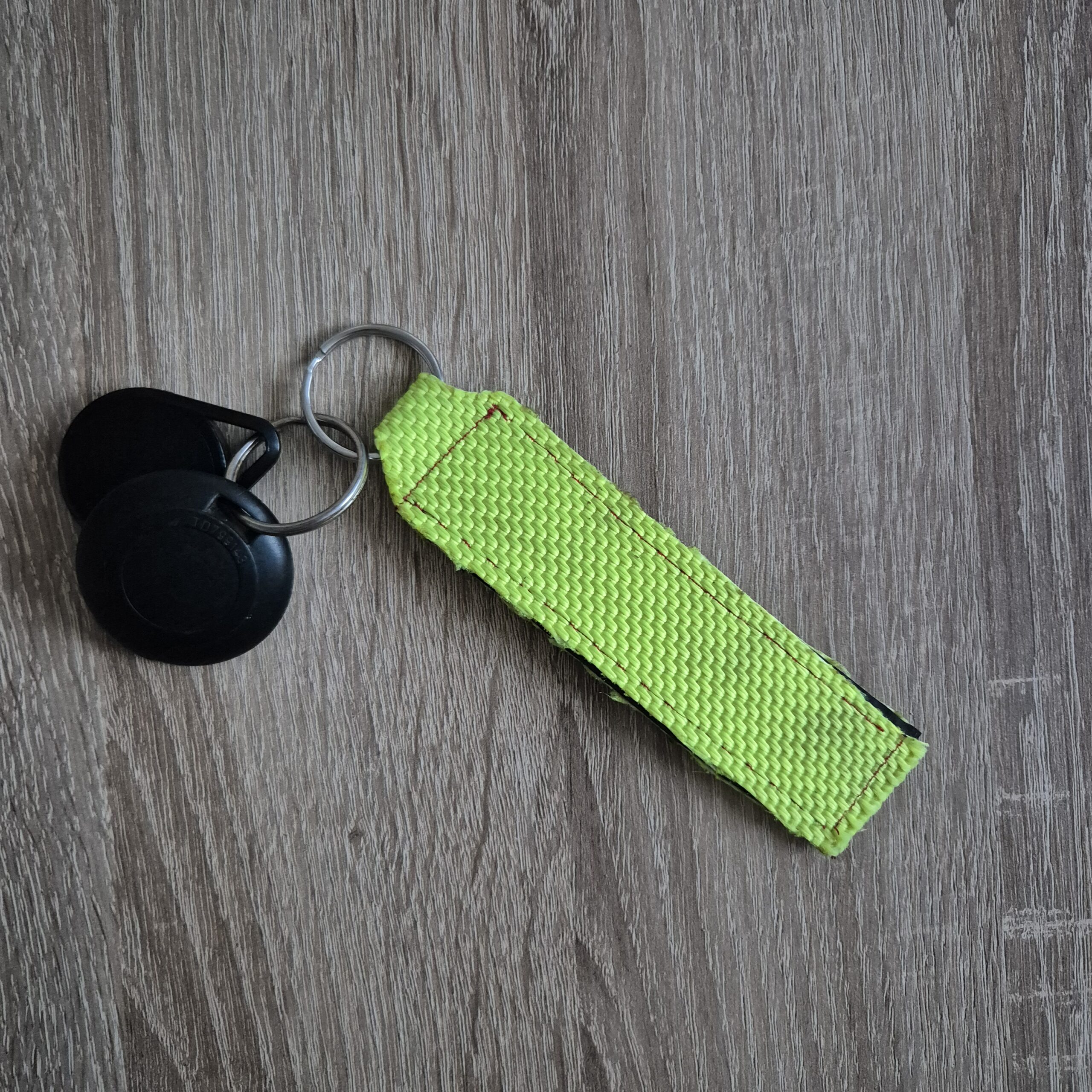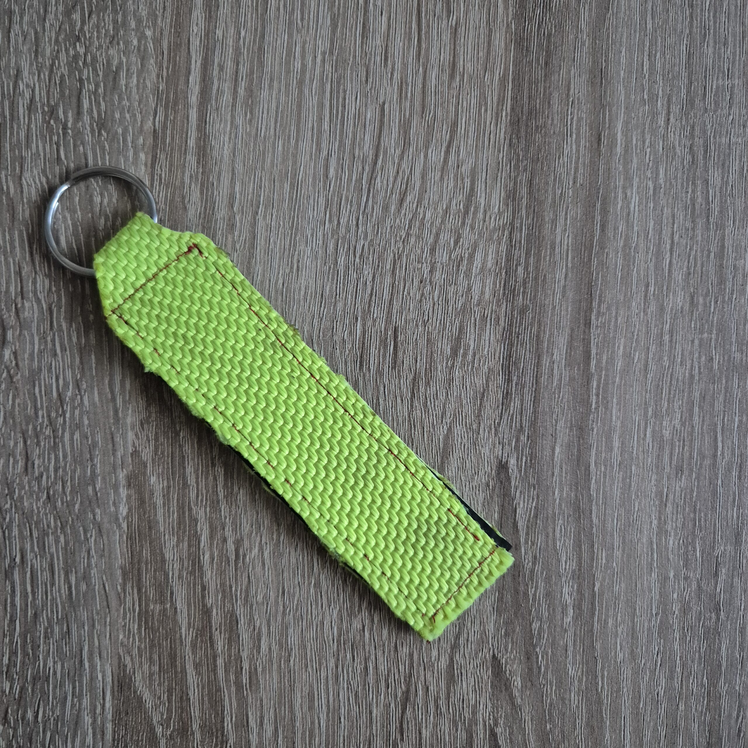 Schlüsselanhänger aus altem Feuerwehrschlauch mit roter Naht. Der Schlüsselring hat einen Durchmesser von 3 cm.