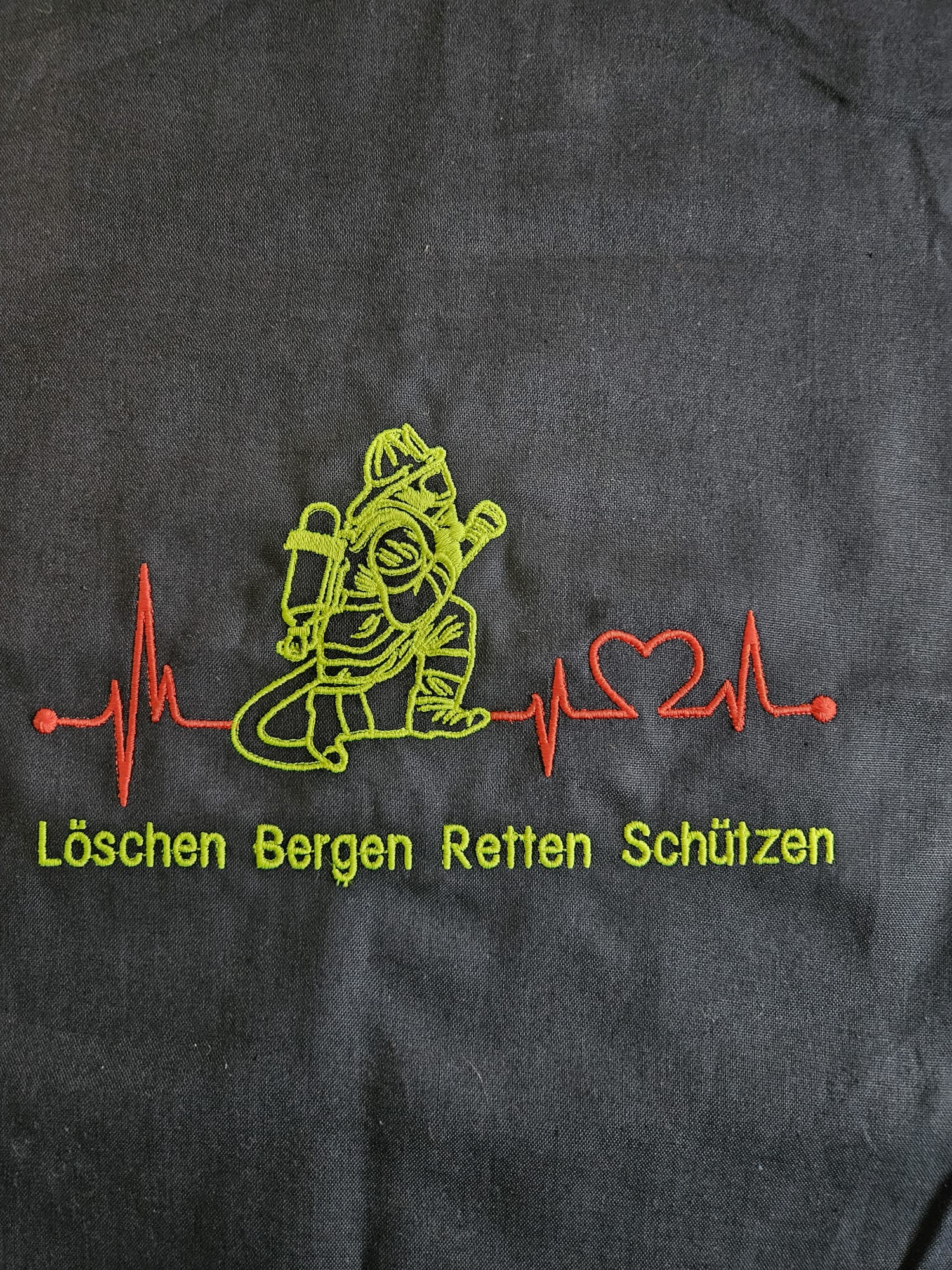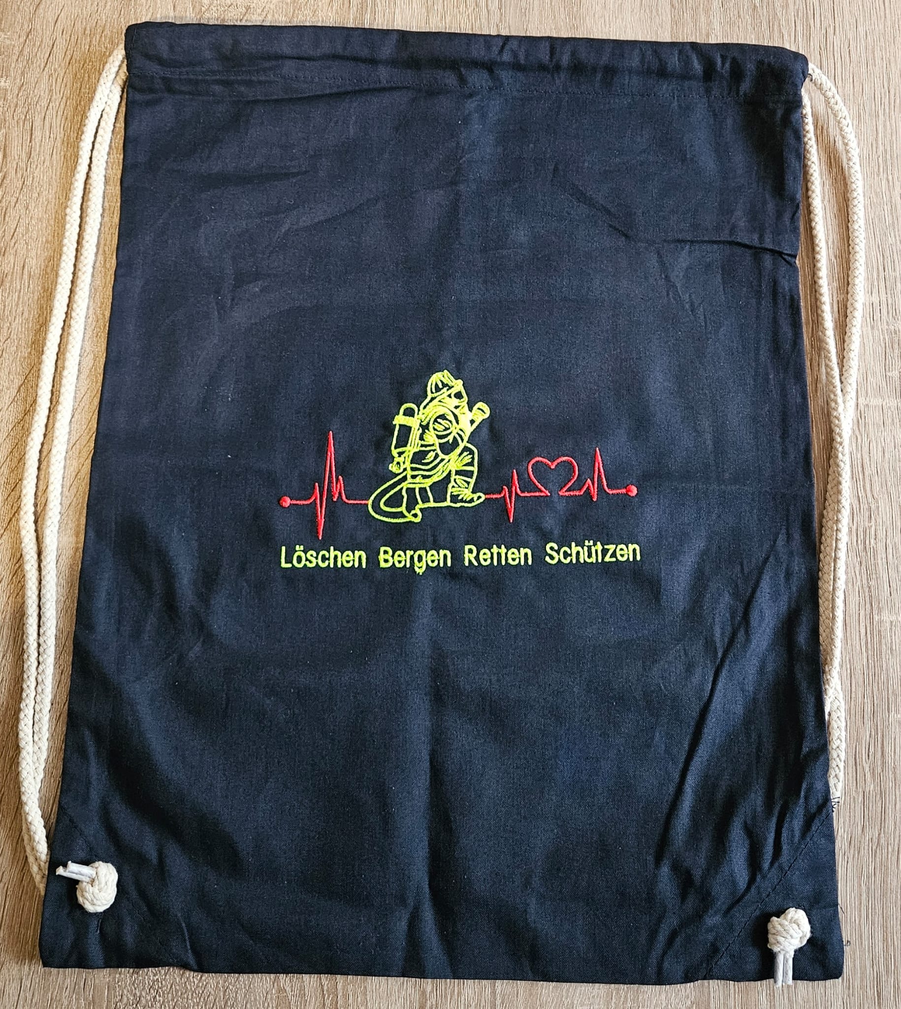 Sehr schöner Turnbeutel mit Logo „Herzschlag Feuerwehr“ in dunkelblau (Navy) Gerne auch anderes Logo (nach Muster) oder Logo mit Namen Maße: 37×46 cm Material: 100% Baumwolle